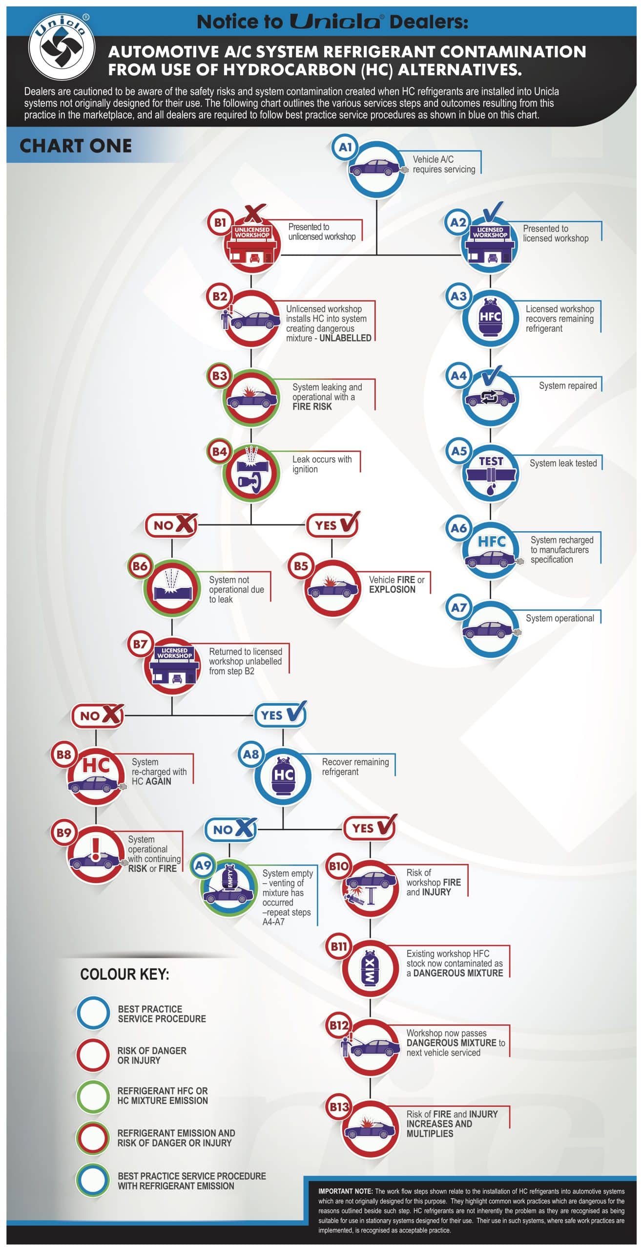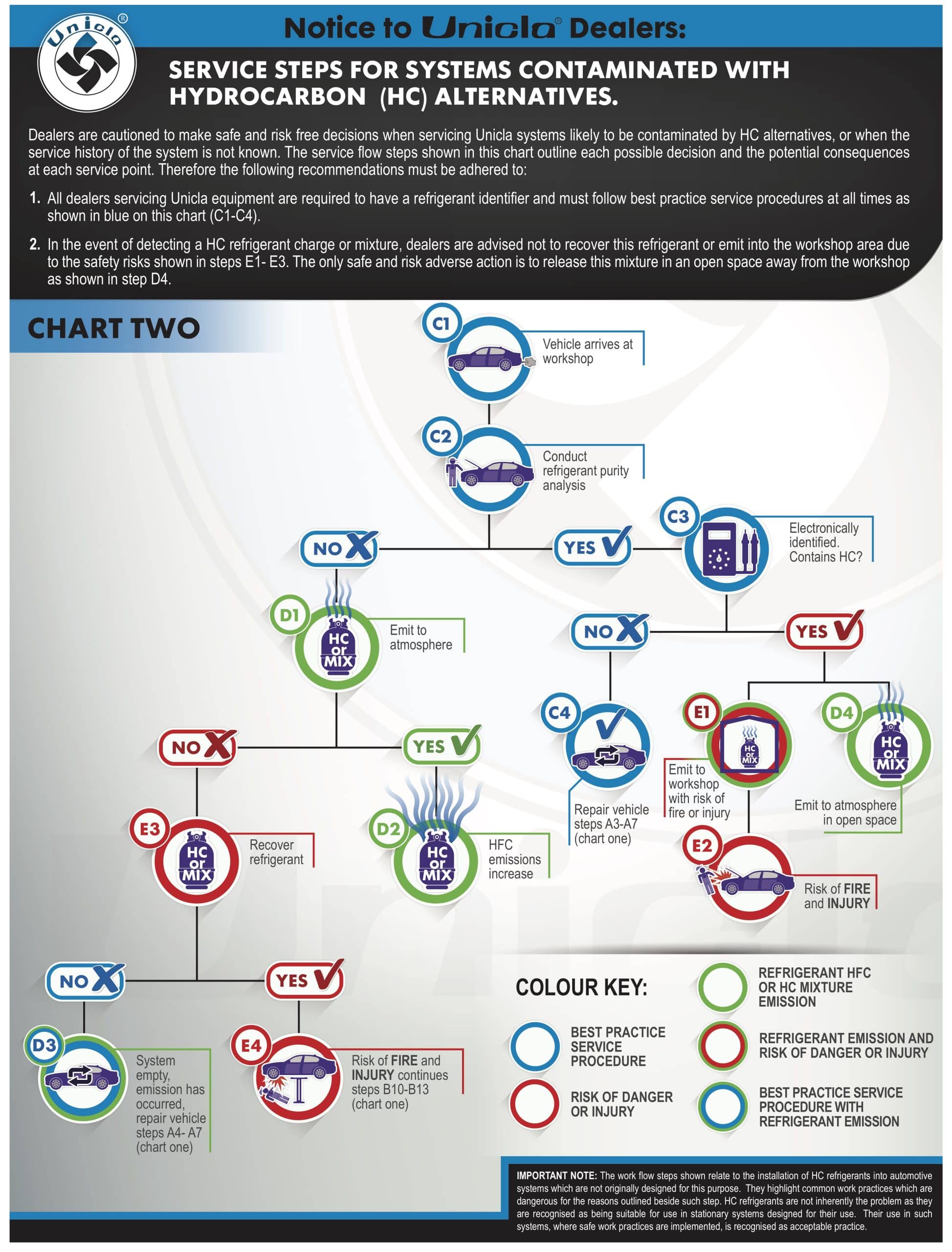 For this reason, Unicla publishes special procedure charts to help manage potential refrigerant cocktails and insists that refrigerant identifiers be used by its distribution and service network.