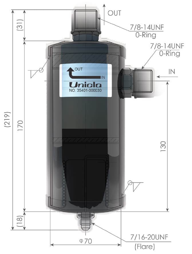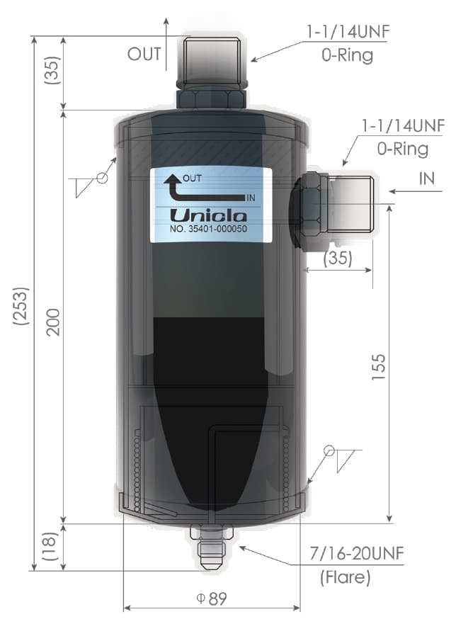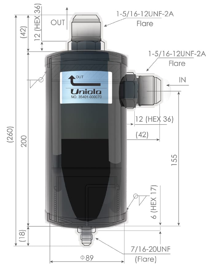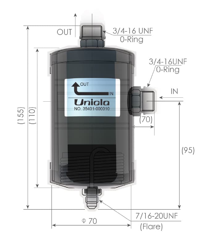 Conexões de flare macho (#16: 1-5/16-12 UNF-2A) para fácil integração com a linha de descarga, e um macho flare (7/16-20 UNF) para a linha de retorno de óleo. O separador de óleo Tipo F é ideal para uso com todos os compressores da série UWX da Unicla (508 a 675 cc) e tem uma capacidade nominal conforme descrito na Tabela 1.