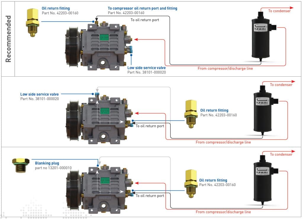 All Unicla compressors (45 to UWX series) have consistent M12 x 1.00 mm access ports at the top, rear and bottom for easy interchange of blanking plugs, service valves, oil return and pressure switch fittings.
