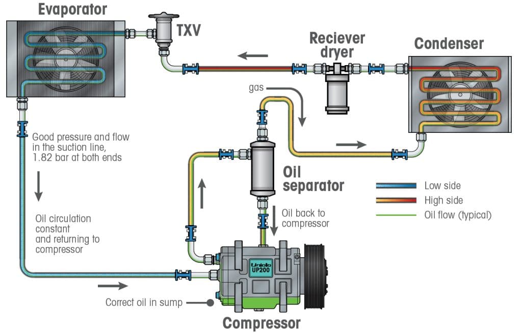 - Temperaturas baixas no evaporador, como encontradas em sistemas de refrigeração de transporte, causando acúmulo de óleo na serpentina do evaporador.