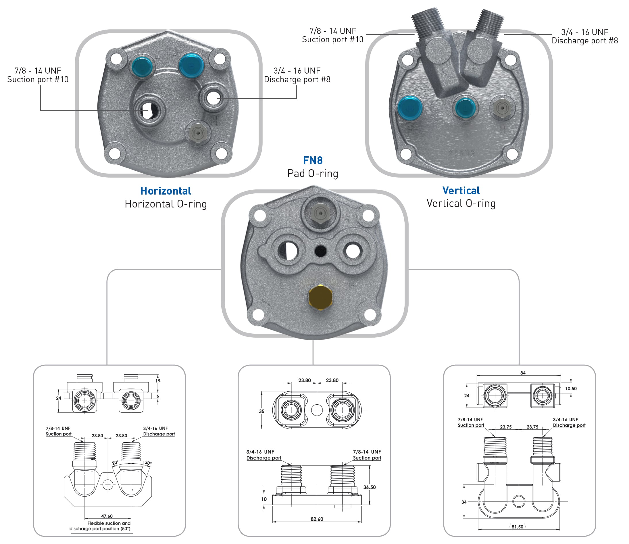 Consistent M12 x 1.0 mm access port size. Easy interchange of blanking plugs, service valves, oil return and pressure switch fittings.